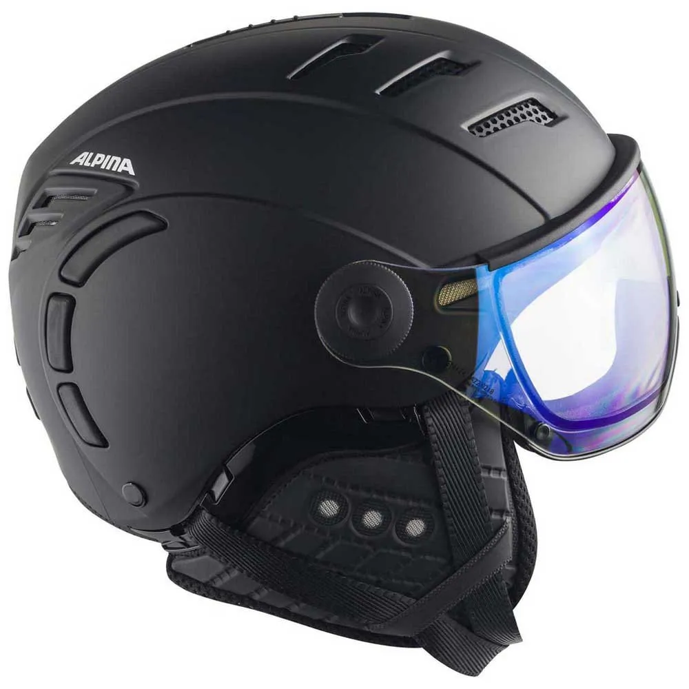 View the full panorama of the mountains and keep all the other skiers and snowboarders in sight on the piste – the visor on the Jump 2.0 VM guarantees this in all weather. Besides offering protection from air streams and enough space to wear optical correction as well, it’s also self-tinting thanks to the high-quality Varioflex technology. This means that the visor automatically adapts to the current weather. The photochromatic lens reacts to visible light. When exposed to radiation, chemical elements open up and create a flat, darkening effect. When the light intensity decreases, the chemical elements close and the lens becomes brighter again. This process takes seconds. The visor also provides 100% protection from UV-A, UV-B and UV-C rays. Unique design, high-quality features and processing, reliable fit: The Jump 2.0 is one of Alpina’s premium visor helmets. Its structure is made of EPS, which allows ventilation to be clearly felt. Air is actively directed to the inside, guided along the head there and transported back out through openings in the rear. This prevents heat from building up and guarantees an optimum climate. The Run System, which allows the helmet to be adjusted to the head’s individual shape, is combined with a neck warmer. This keeps the neck comfortably warm even on cold, windy days of skiing and also makes it more comfortable to wear. No feature is left out of the Jump 2.0 VM – so winter athletes can fully enjoy their day on the piste.