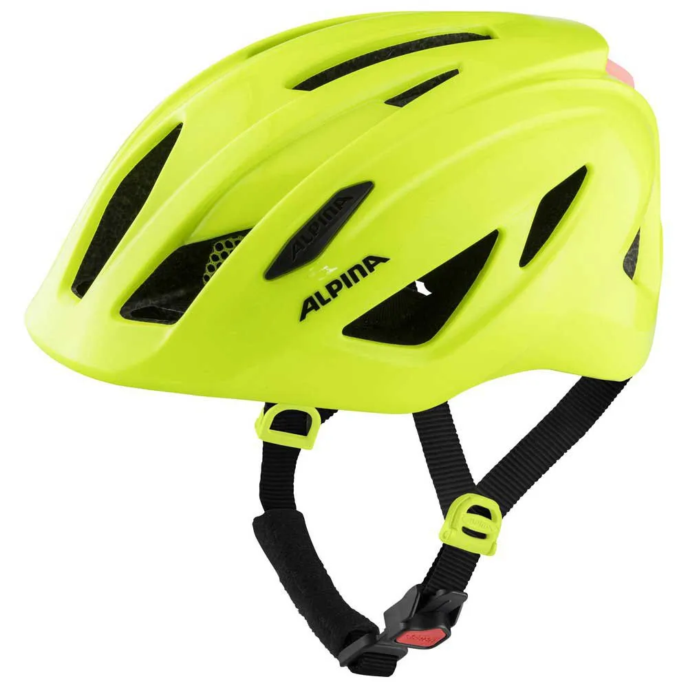 The ALPINA PICO FLASH is a bike helmet for kids and youths. The inmold construction, fly screen, plenty of ventilation openings and a flash light on the rear make the helmet safe and comfortable to wear. The built-in visor on the ALPINA PICO is particularly striking, offering protection from direct sunlight and extra safety in the event of a fall. Three ventilation openings are integrated into it to prevent heat build-up. Another twelve ventilation openings ensure that the head is well ventilated, even in summer. Fly screens on the front keep insects from wandering into the bike helmet. The Run System Ergo Flex+ provides comfort and optimal adjustment possibilities. The light and delicate design clings evenly to the head and thus increases protection. The Run System can be adjusted by means of a fine ratchet system. Thanks to the inmold construction, with which the Hi-EPS inner shell under the outer shell is foamed under high pressure and heat, the ALPINA PICO FLASH is lightweight yet secure. The neon and pink colours provide extra visibility – and thus safety.