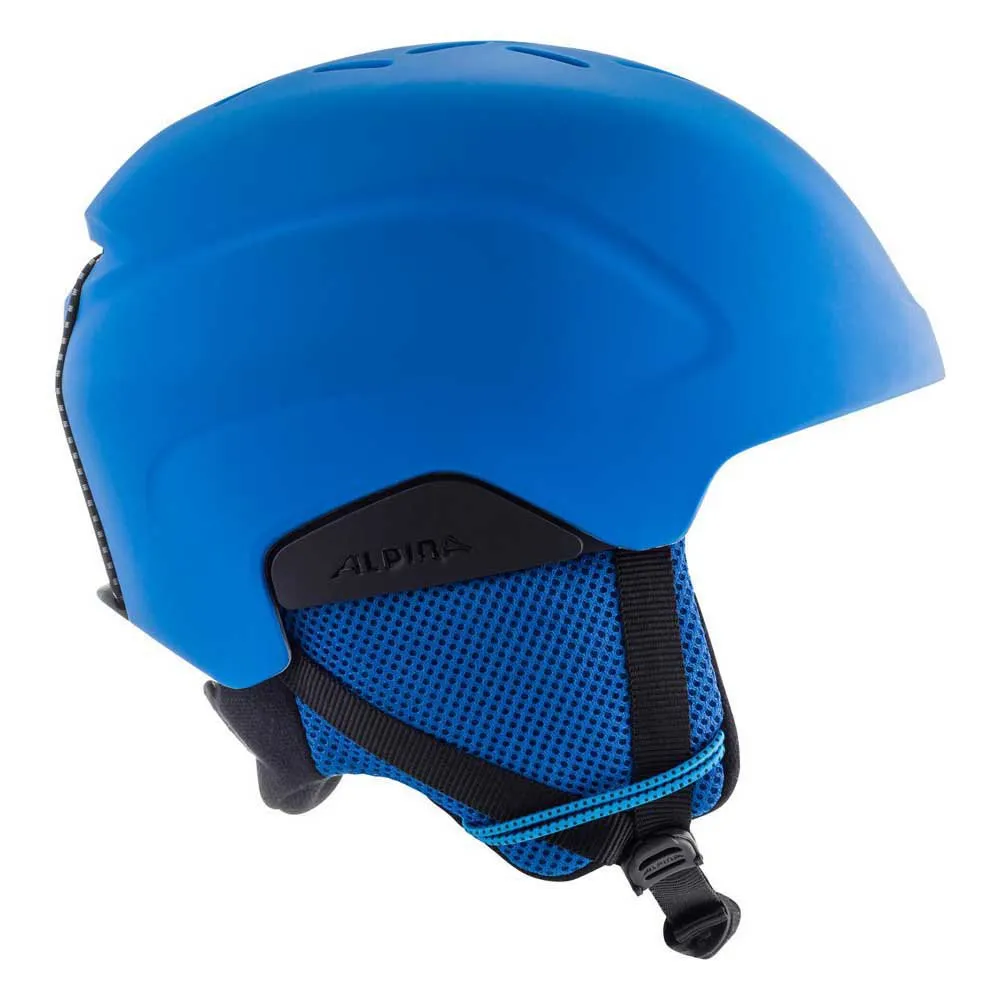 – Proven a hundred thousand times over and used on all Alpina helmets: the strap buckle with the red push button and multi-step automatic locking mechanism. Ergomatic can be operated with one hand – you can loosen the strap on the way up the mountain and tighten it for downhill – and in a fall the locking mechanism cannot open automatically.